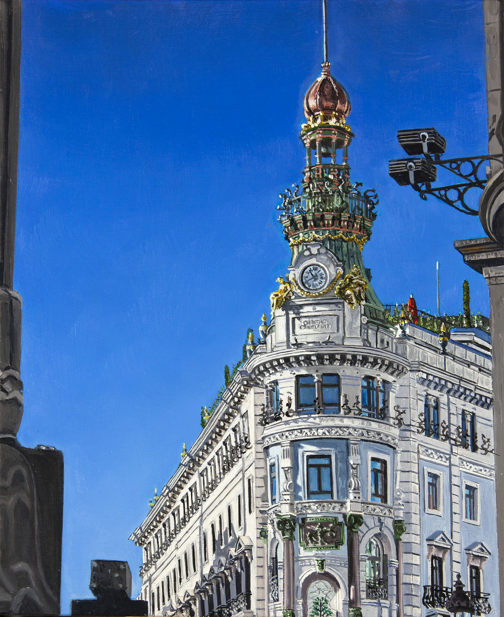 18.- De Madrid al Cielo, edificio en calle Goya, 25 Óleo sobre tabla 27 X 22 cm. Año 2009