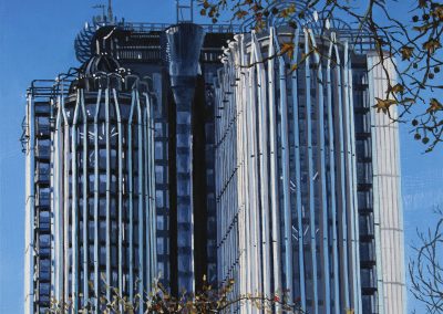 11.- De Madrid al Cielo, Edificio Mutua Madrileña, Paseo Castellana, 33 Óleo sobre tabla 27 x 22 cm. Año 2006
