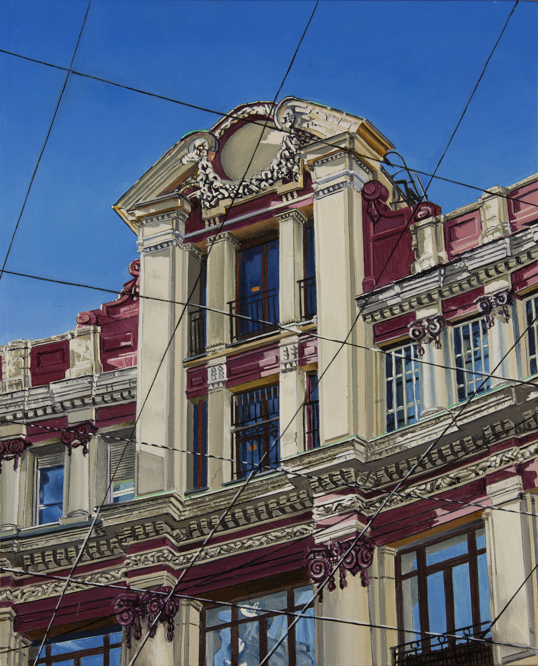16.- De Madrid al Cielo, torre del edificio Panadería Óleo sobre tabla 27 X 22 cm. Año 2009